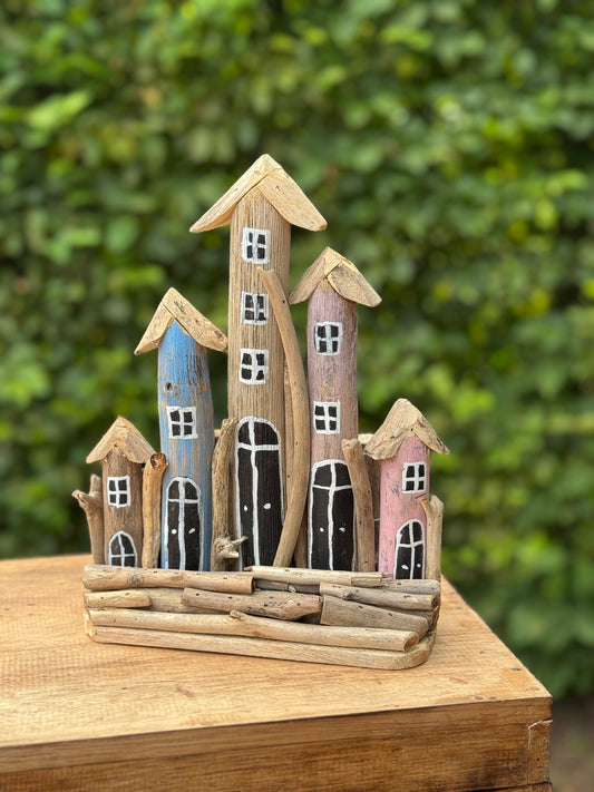 Drijfhout huisjes – rij van 5 (ca. 25 cm hoog)