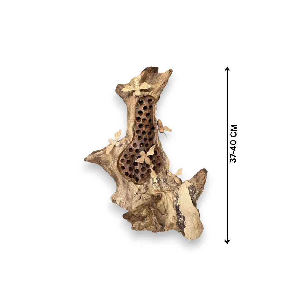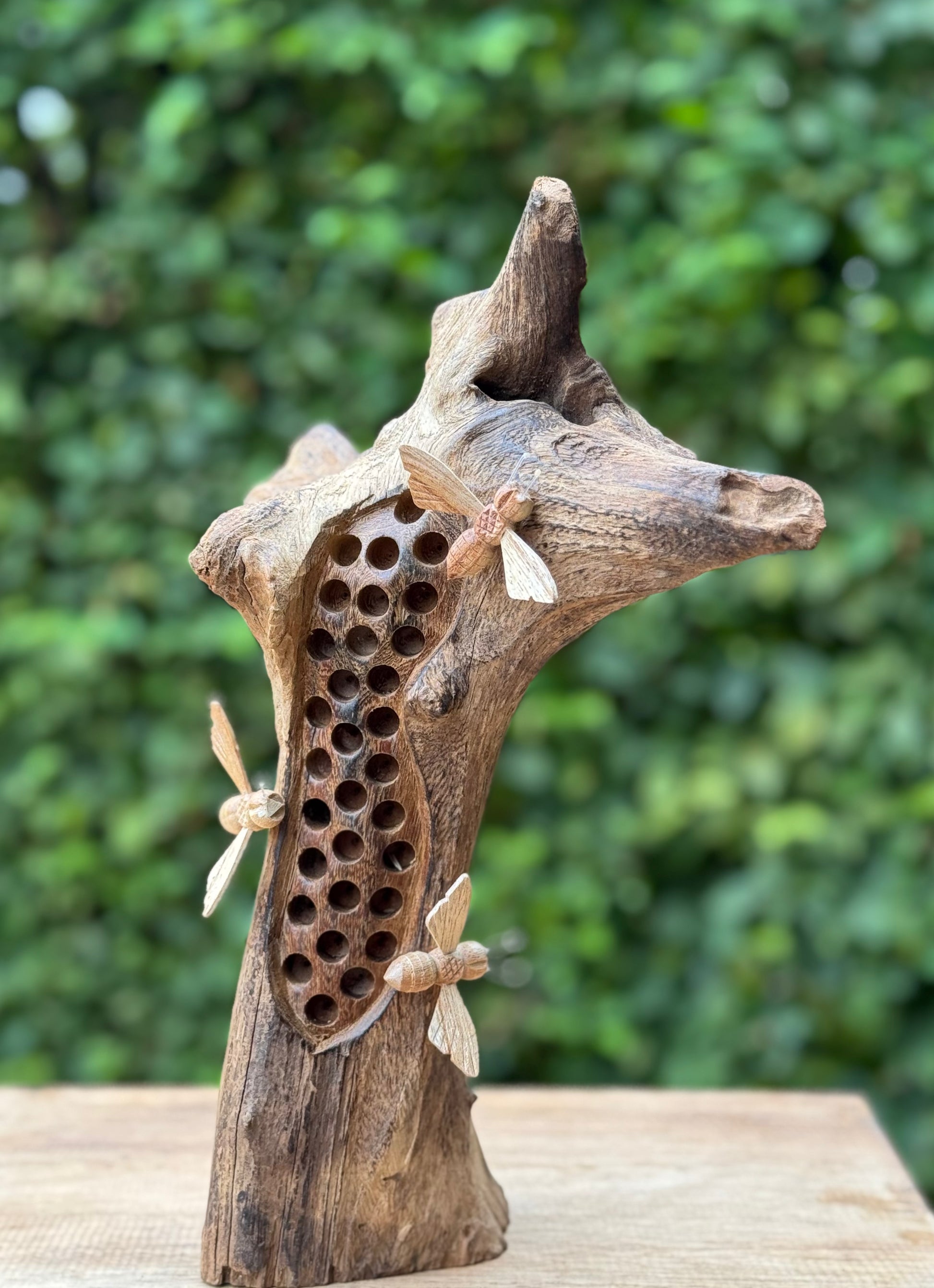 Een sfeervol handgemaakt bijenhotel met drie kleine bijtjes. De bijtjes zijn onbeschilderd, waardoor de natuurlijke uitstraling van het hout volledig tot zijn recht komt. Elk stuk is uniek door de variatie in vorm en structuur.