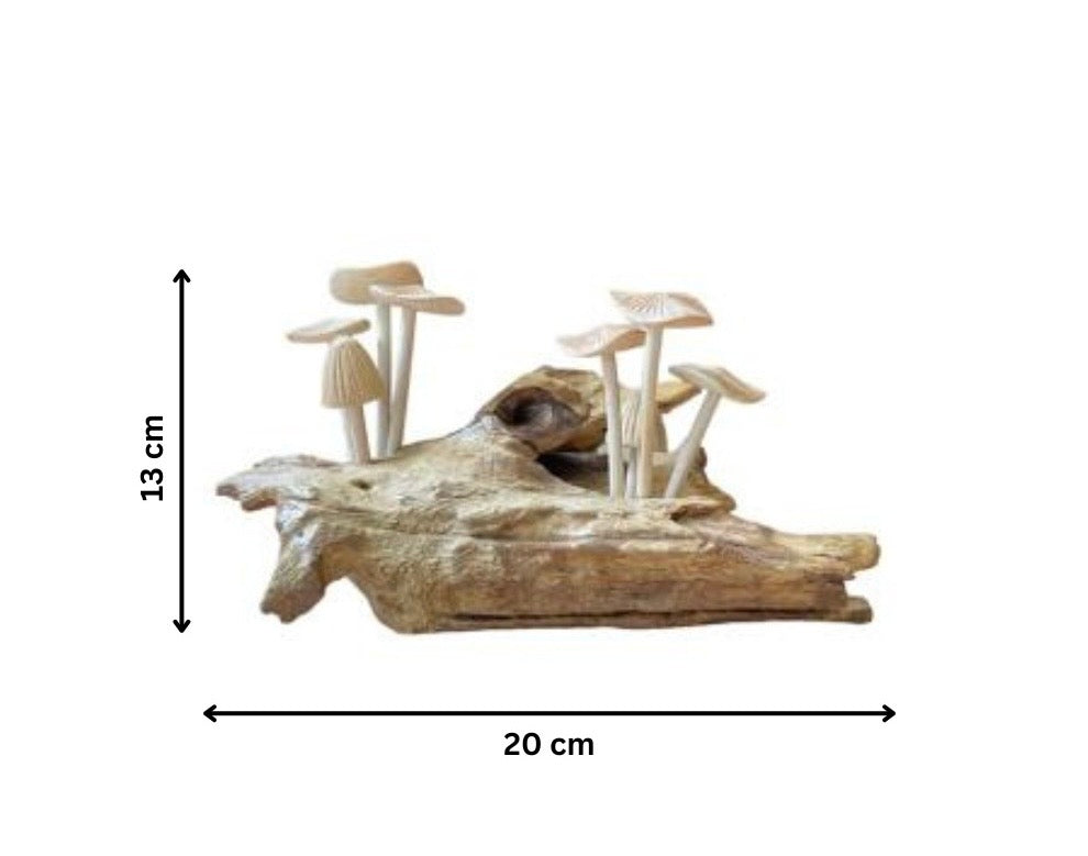 Dit natuurlijke decoratiestuk bestaat uit een lang stuk moerashout waarop in totaal acht paddenstoelen zijn geplaatst: vier links en vier rechts. De combinatie van verschillende houtsoorten geeft het geheel een levendige en ambachtelijke uitstraling.