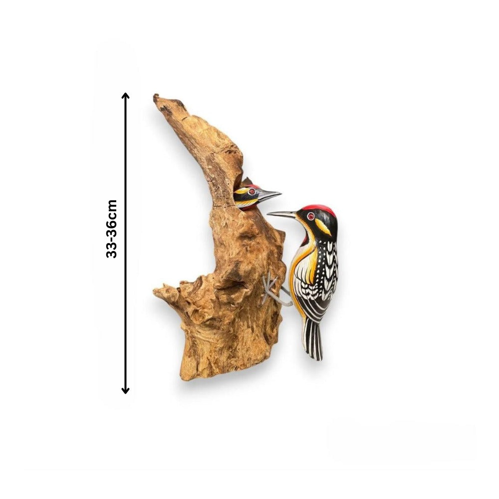 Een duo van spechten, ieder met een eigen uitstraling: één specht zit volledig zichtbaar op de stam, terwijl de ander subtiel met alleen het kopje uit het hout tevoorschijn komt. Beide vogels zijn met de hand gesneden en zorgvuldig beschilderd. Verkrijgbaar in groene en bonte uitvoering. Afgewerkt met een glanzende lak voor een levendig effect. Het gamalhout is zorgvuldig schoongemaakt, waardoor de natuurlijke vorm prachtig zichtbaar blijft.