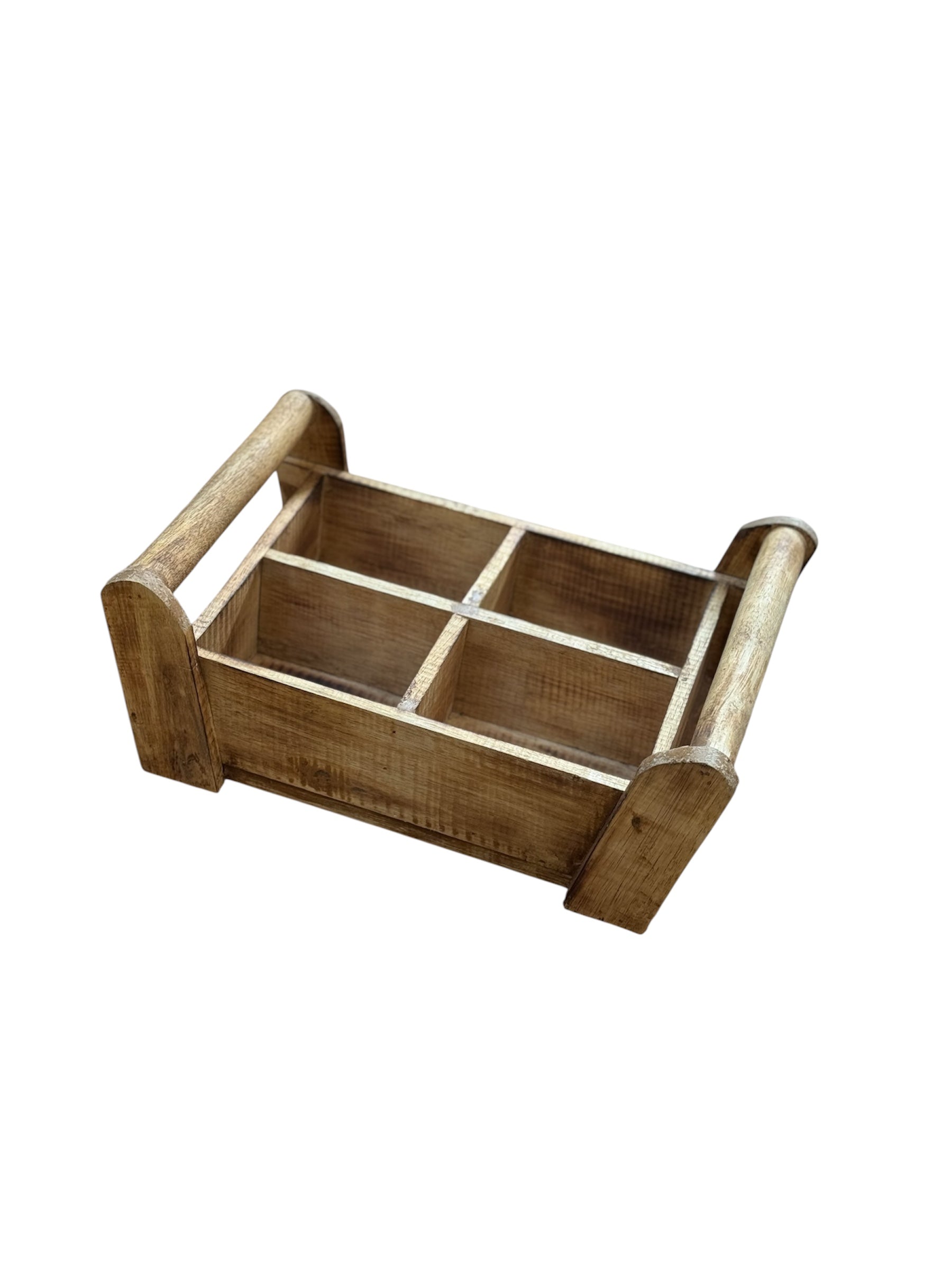 Een handgemaakte tray met 4 vakken, uitgevoerd in Kayu-hout. Het hout is naturel afgewerkt met een gevlamde/ licht gebrande finish, waardoor de tray een warme, antieke uitstraling krijgt.