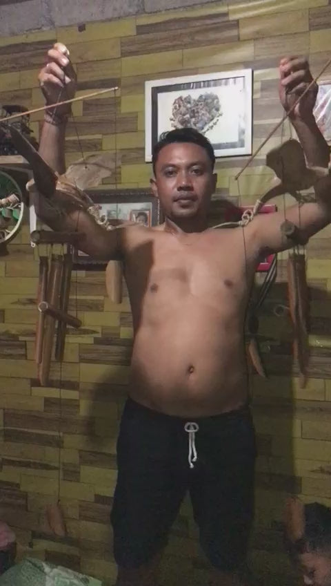 Bijzondere windgong van natuurlijk bamboe met een rijk gedetailleerde draak. Uitgevoerd met vleugels en verfijnde details, waardoor dit model duidelijk breder en opvallender is dan de standaard windgongs. Handgemaakt in Indonesië en voorzien van een diepe, rustgevende klank. Hoogte ca. 60 cm.